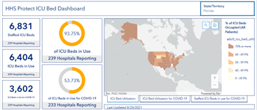 Hospital Utilization is also tracked by the HSS. Searching by facility does not include the number of Covid-19 patients. However, after scrolling down to Inpatient Bed Utilization by State, you can choose Florida. These are for August 24, 2021: