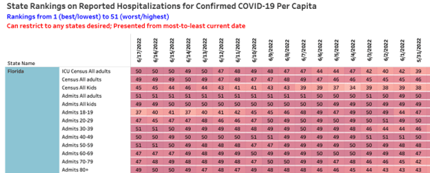 Florida improves to 2nd worst in the US for adult Covid admissions. Since June 6, 2022, this is one of 4 days that the state has not ranked worst: