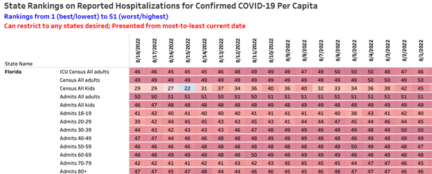 Florida is the worst in the US for adult admissions, 2nd worst for ICU patients, 3rd worst for adult hospitalizations, and 3rd worst for pediatric admissions: