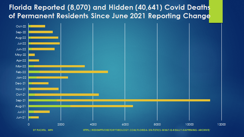 During June 2021–October 2022, Florida reported only 8,070 of the 48,571 Covid deaths among permanent residents as “New Deaths” (17%):