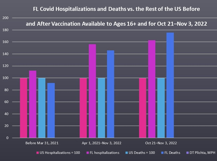 Since April 2021, permanent Florida residents have been 46% more likely to die than people living elsewhere in the US (76% higher during October 21–November 3, 2022). Prior to that, death was 8% less likely for Floridians. Similarly, Florida hospital admissions are 56% higher than in the rest of the US since April 2021.