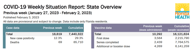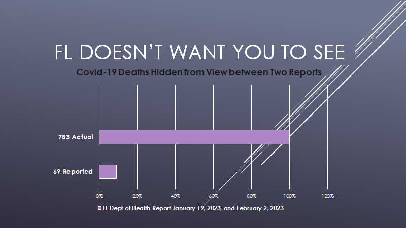 Florida publishes official reports every two weeks. During January 20–February 2, 2023, there were 783 Covid deaths in the state. The FL Department of Health reported 69 of them as New Deaths (9%):