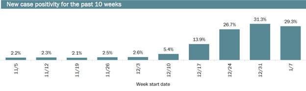 Public health experts view a positivity rate of 5% or below sufficient to capture all Covid cases. During that same period ending on December 23rd, the positivity rate rose from 2.6% to 13.9%. So, the actual number of cases was likely 180% higher than what the state reported: