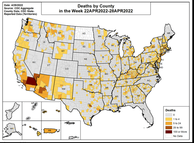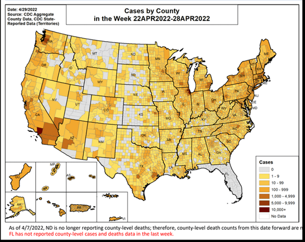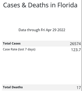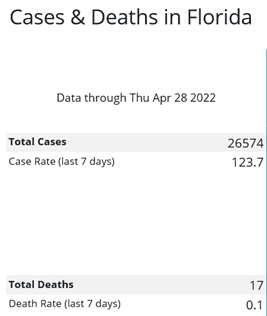 Although Florida counties reported Covid cases and death statistics for April 22–28, 2022, as of May 2nd, the state has reported only the total numbers (26,574 and 118 respectively). We have no county-specific data from the CDC.