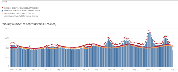 - During June 2021–April 2022, Florida has reported only 7,183 of the 38,834 Covid deaths among permanent residents as “New Deaths” (18%).