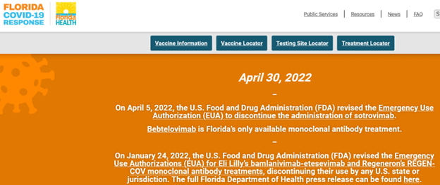 During the first week of January 2022, hospitals in Florida used 140 of the state’s stockpile of 4,400 Sotrovimab doses, in contrast to over 2,700 doses of the ineffective Regeneron monoclonal antibody.