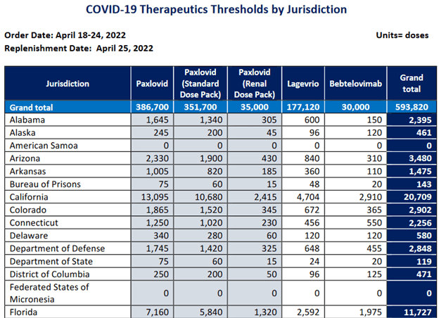 HHS: COVID-19 Therapeutics Thresholds, Orders, and Replenishment by Jurisdiction