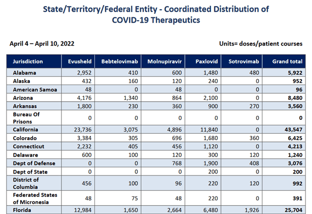 Florida received a monthly allocation of 12,984 doses of Evusheld during April 4th–10th: