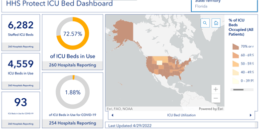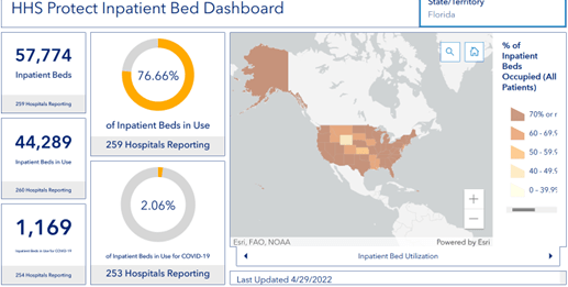 On the morning of April 29, 2022, 77% of hospital beds in Florida were full, up from 78% last week. Covid patients accounted for 1,169 of them (2% of utilized beds, also the same as last week).