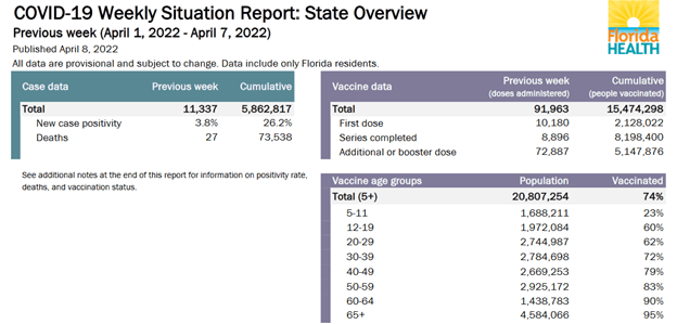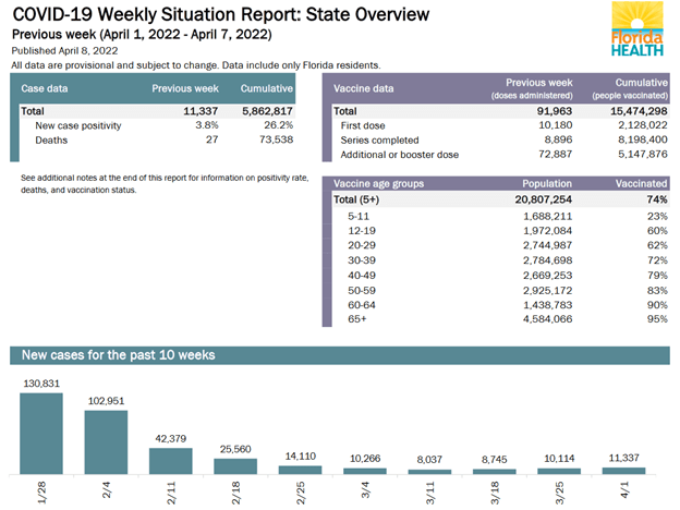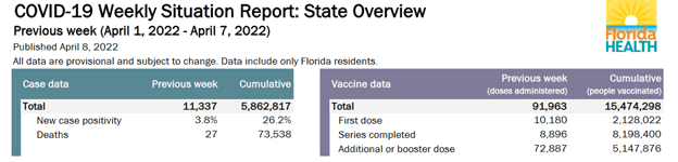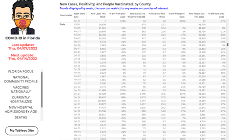 Beginning in June 2021, Florida removed all archived Covid data from their web site. Until March 17th, they replaced the statistics from the previous week with a new report.