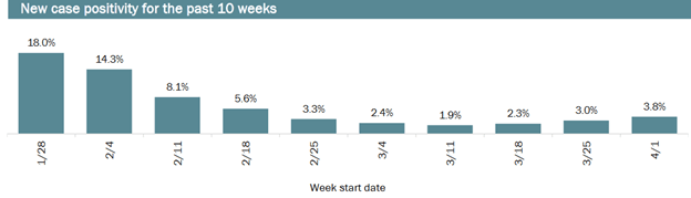 - Public health officials recommend maintaining a positivity rate <5% for 2 weeks before reopening. We have now met that goal on a state-wide level.