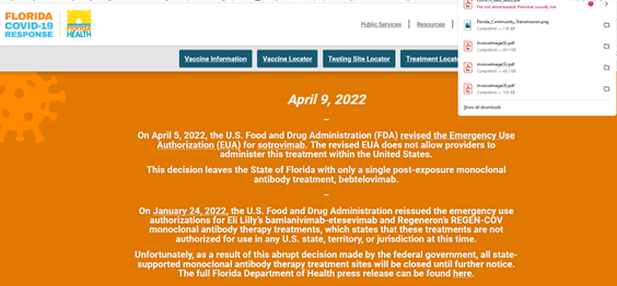 Sotrovimab is 27 times less effective against BA.2 than for BA.1. Therefore, on April 5, 2022, the FDA amended the Emergency Use Authorization to revoke the use of Sotrovimab nationwide. That did not include Florida until this week.