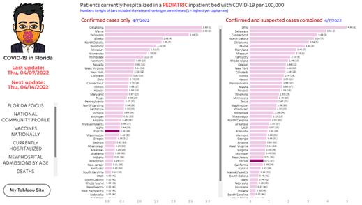 Pediatric hospitalizations are 10% lower than a week ago, with 18 children in Florida hospitals on April 7, 2022.
