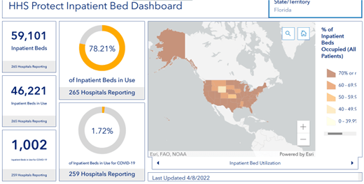 HHS tracks Hospital Utilization. On the morning of April 7, 2022, 78% of hospital beds in Florida were full, the same as last week.