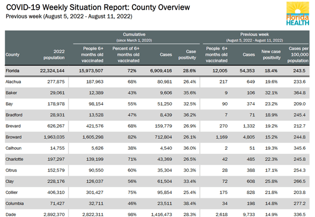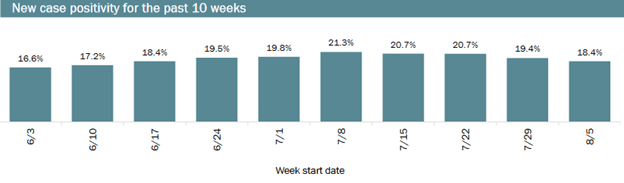Using a 5% positivity rate as the standard for detecting all cases, there were approximately 182,000 cases in Florida during August 12–18, 2022, a drop of 28% in one week.