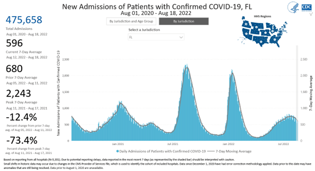 During August 12–18, 2022, there was an average of 596 admissions per day, a total of 4,170. That was a decrease of 12% from the previous week (680/day) but 10.6% of all US Covid admissions.