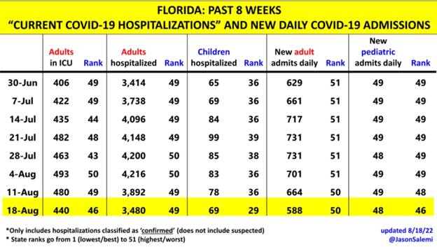 On August 18th, Florida was the 2nd worst in the nation for adult Covid admissions. Since 6-6-22, this is one of only 4 days that the state has not ranked last.