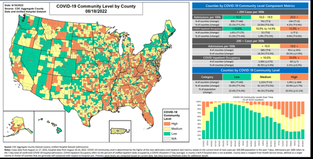 On August 18, 2022, 3,480 adult Covid patients were hospitalized (-11%). Adult hospitalizations have been 3rd worst for two weeks, an improvement from two weeks of being 2nd worst.