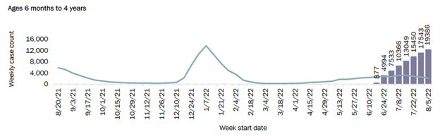 During August 1, 2020–August 18, 2022, there have been 15,164 pediatric hospital admissions with confirmed Covid in Florida, with 175 of those in the last week: