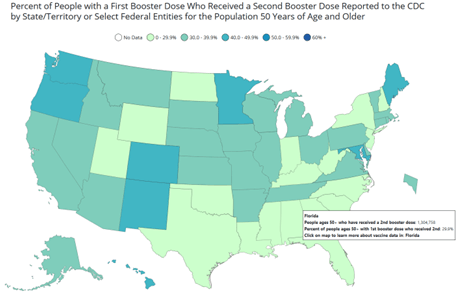 A 2nd booster is much less effective at preventing infections. For people 50+ during July 17–23, having at least 2 boosters prevented 72% of cases; 1 booster prevented 67%; and a primary series prevented 78%.