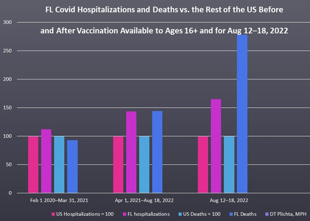 Since everyone 16+ became eligible for vaccination on April 1, 2021, people in Florida were 44% more likely to require Covid hospitalization than people in the rest of the US. For August 11–18, 2022, that elevated risk rose to 65%: