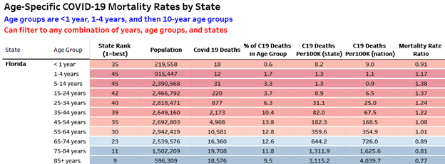During August 12–18, 16.7% of all Covid death reports in the US came from Florida, a state with 6.6% of the US population. That is 2.8x the death rate for that week compared to the rest of the US. People in FL were also 65% more likely to need hospital care.