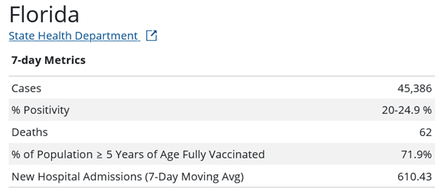 Nevertheless, that was 73% fewer compared to the peak during August 11–17, 2021, when there were 10.42 admissions/100,000 Floridians: