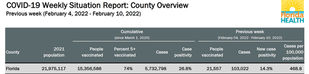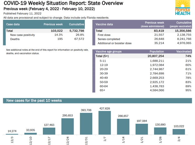 - On the February 10th report, Florida reported 5,732,798 cumulative cases among permanent residents.