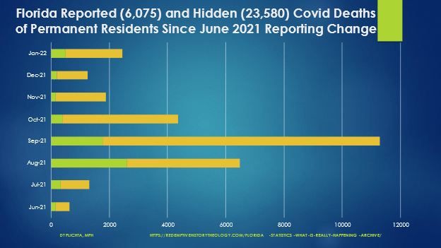 - During June 2021–January 2022, Florida has reported only 6,075 of the 29,655 Covid deaths among permanent residents as “New Deaths” (20%).