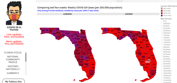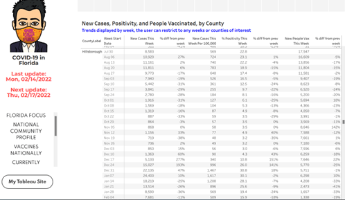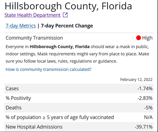 Dr. Jason Salemi, a professor from the University of South Florida, has been compiling data from the state since May 28th, when the reporting drastically changed. His county-level data are quite helpful. Note that the date reflects the beginning of the week. It indicates that Hillsborough County’s case rate fell 10%, from 569/100,000 people to 509/100,000 during February 4–10, 2022. On his site, you can click on the maps for detailed information on each county: