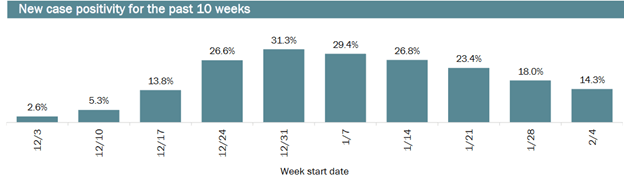 - A 12% positivity rate, meaning the actual number of cases is likely 1.4 times higher. This is a decrease of 4% from the previous week.