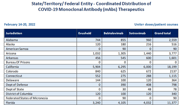 Five weeks ago, hospitals in Florida used 140 of the state’s stockpile of 4,400 Sotrovimab doses, in contrast to over 2,700 doses of the ineffective Regeneron monoclonal antibody. On January 18th, the state announced the opening of additional monoclonal antibody infusion centers to distribute what remained of the 15,000 additional doses of Regeneron secured on January 7th.
