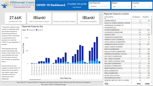 In the Hillsborough County School District, as of February 10, 2022, there have been 27,536 cases during this school year. The 800 cases reported during February 4–10, 2022 constitute a 49% decrease from the previous week (1,568 during January 28–February 3, 2022).