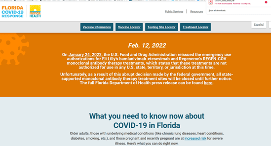 Until January 8th, the state continued to emphasize monoclonal antibody treatment as the focus of the Covid-19 Response web site. Mutations which have resulted in the omicron variant render ineffective almost all the monoclonal antibodies currently in use, including the antibody combination used in Regeneron against the delta variant (imdevimab and casirivimab). In the region which includes Florida, 99.9% of cases are now due to the omicron strain. Four weeks ago, 98% were omicron: