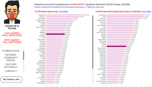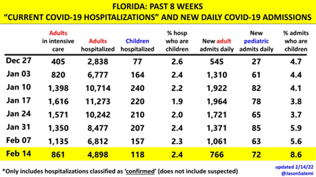 - Pediatric hospitalizations fell 25%, with 118 in FL hospitals on Feb 14, with a 1% decrease to 72 admissions/day.