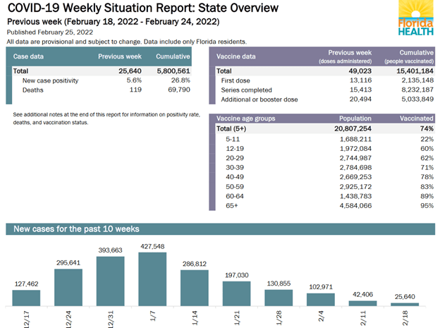 - On the February 10th report, Florida reported 5,800,561 cumulative cases among permanent residents.