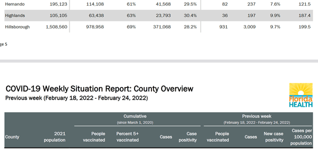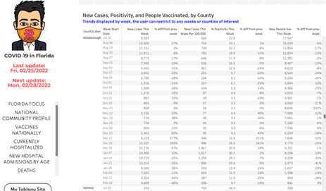 Dr. Jason Salemi, a professor from the University of South Florida, has been compiling data from the state since May 28th, when the reporting drastically changed. His county-level data are quite helpful. Note that the date reflects the beginning of the week. It indicates that Hillsborough County’s case rate fell 30%, from 287/100,000 people to 200/100,000 during February 18–24, 2022. On his site, you can click on the maps for detailed information on each county: