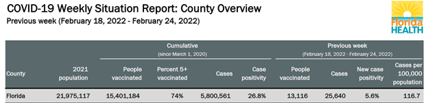 Following six weeks of large increases since the omicron variant was first detected, Florida began a downward trajectory six weeks ago. However, our new cases are still 166% higher than in mid-November (9,642 reported on 11-19-21). A new case positivity rate of 5.6% means there is likely one unreported case for each ten positive tests: