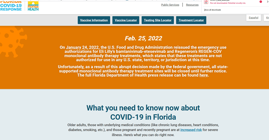 - DeSantis objected to no shipments; all FL antibody infusion centers closed on 1-25-22.
