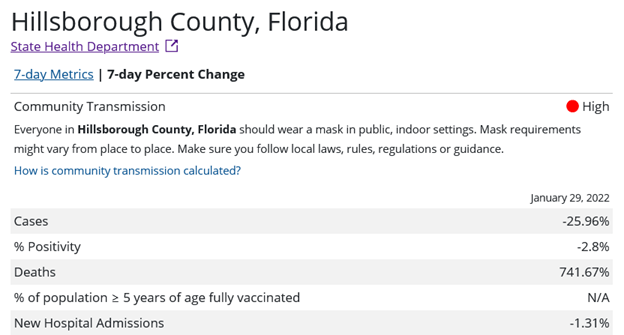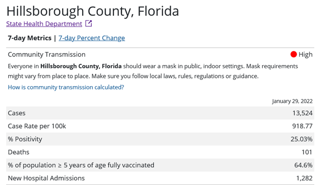 In the Hillsborough County School District, as of January 27, 2022, there have been 25,168 cases during this school year. The 2,803 cases reported during January 21st–27th constitute a 33% decrease from the previous week (4,176 during January 14–20, 2022).