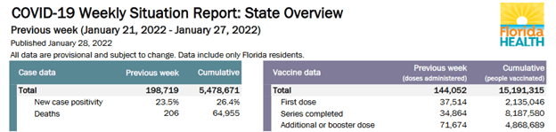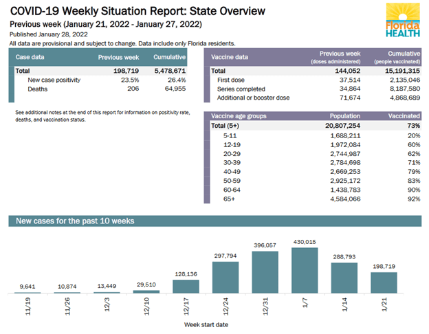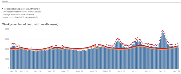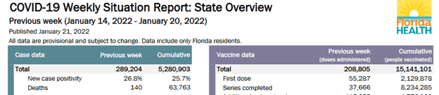 Until January 1, 2022, Florida was the only state in the US which was releasing statistics on a weekly basis. Tennessee has now switched to that schedule. Information available in Florida’s reports is far more limited than what the state formerly provided.