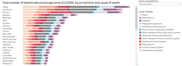 - CA has 70% more people than Florida, yet the same number of excess deaths.