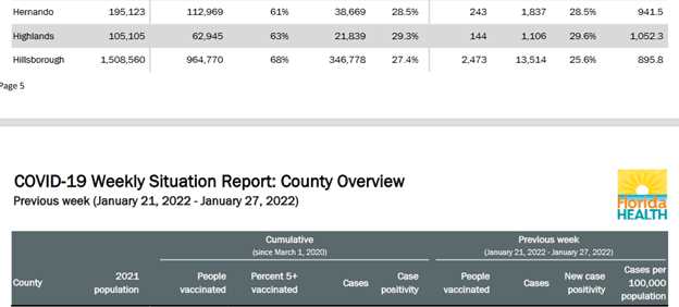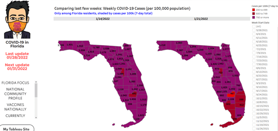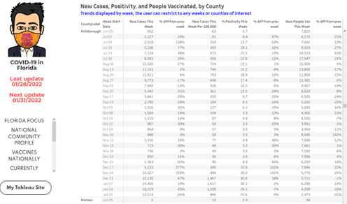 Note that the date reflects the beginning of the week. It indicates that Hillsborough County’s case rate fell 26%, from 1,208/100,000 people to 896/100,000 during January 21–27, 2022. On his site, you can click on the maps for detailed information on each county:
