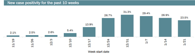 - A 23.5% new case positivity rate means there are likely 3.7 unreported cases for each + test.