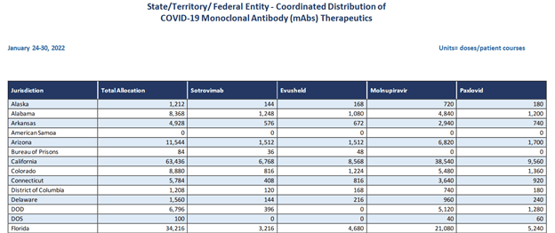 - During 1-24 to 1-30, the federal government sent 32,000 doses of outpatient treatments.