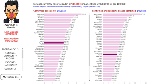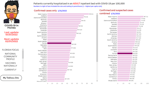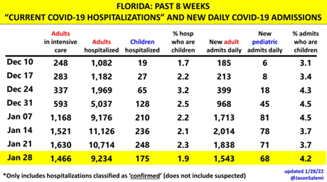 - For August 1, 2020–January 27, 2022, 9.0% of all US Covid hospitalizations were in FL (6.6% of US population).