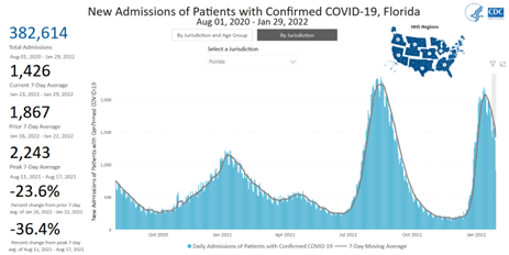 For January 21–27, 2022, there was an average of 1,617 admissions per day, a total of 11,322. Overall, there was a decrease of 21% from the previous week (2,059/day) and 28% fewer compared to the peak during August 11–17, 2021 when there were 10.42 admissions/100,000 Floridians.