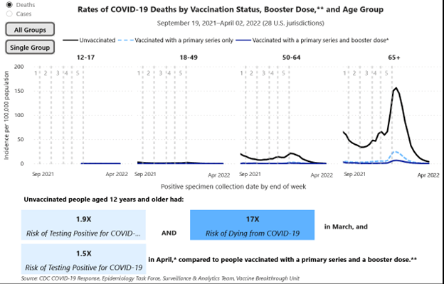 - Compared to people with boosters during February 19–26, 2022, unvaccinated people aged 18–49 were five times more likely to die; it was 26 times for ages 50–64; and 12 times for senior citizens.