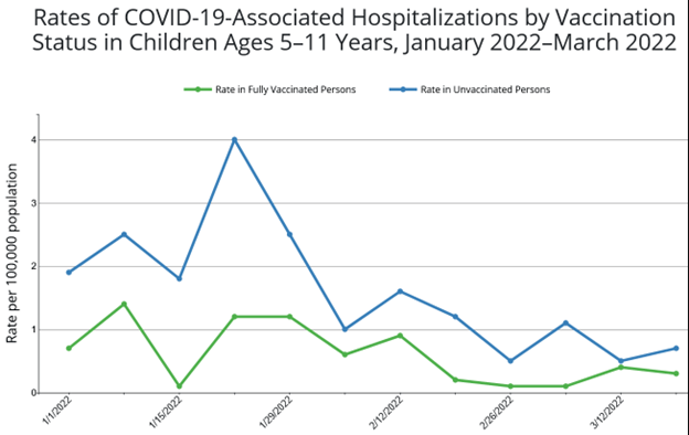 - During March 12–19, 2022, unvaccinated children aged 5–11, were 133% more likely to need hospital admission than their vaccinated peers. Those aged 12–17, were 20% less likely.