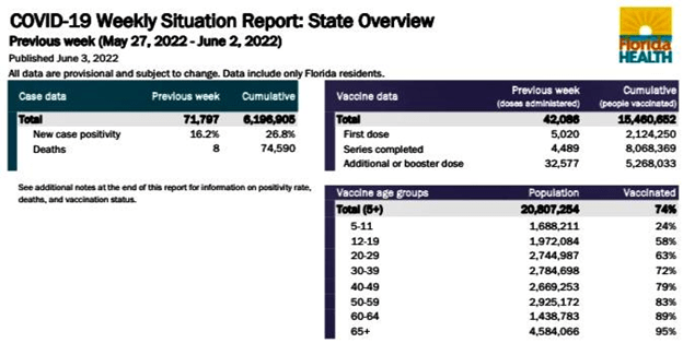 - 80% of deaths in Florida occurred among senior citizens during May 20–June 2, 2022.